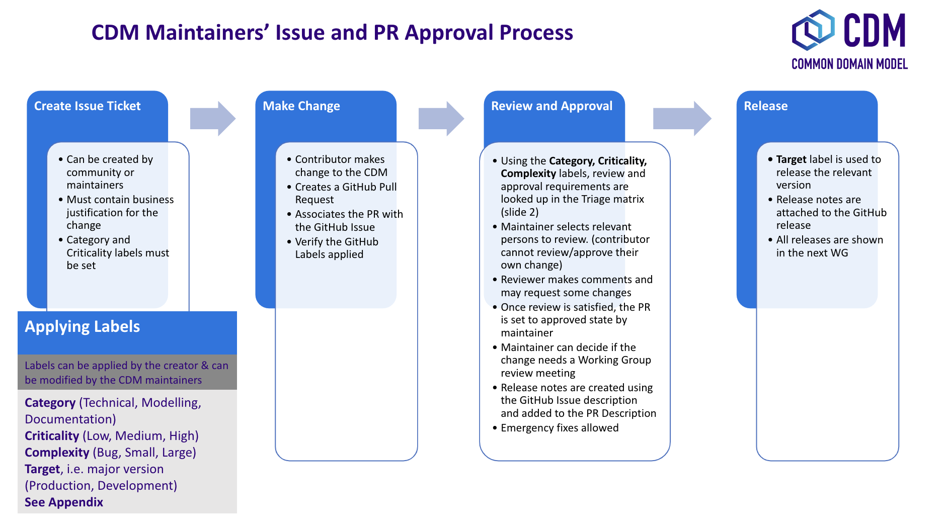 - approval by CDM Maintainers and/or CDM Architecture and Review Committee,