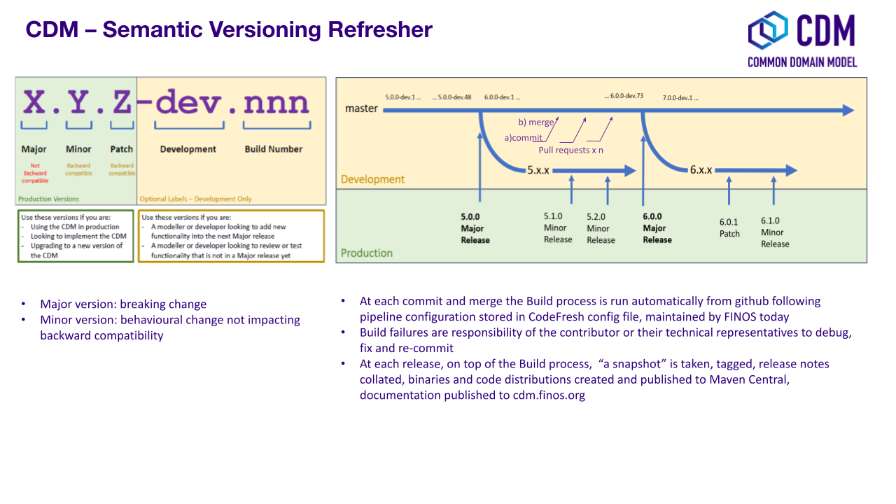 - Quality assurance. Seek the early appointment of at least one CDM Maintainer who can assist modelling discussions and provide early feedback. CDM Maintainers are appointed by the CDM Owners as and when relevant. Please contact cdm@lists.finos.org.