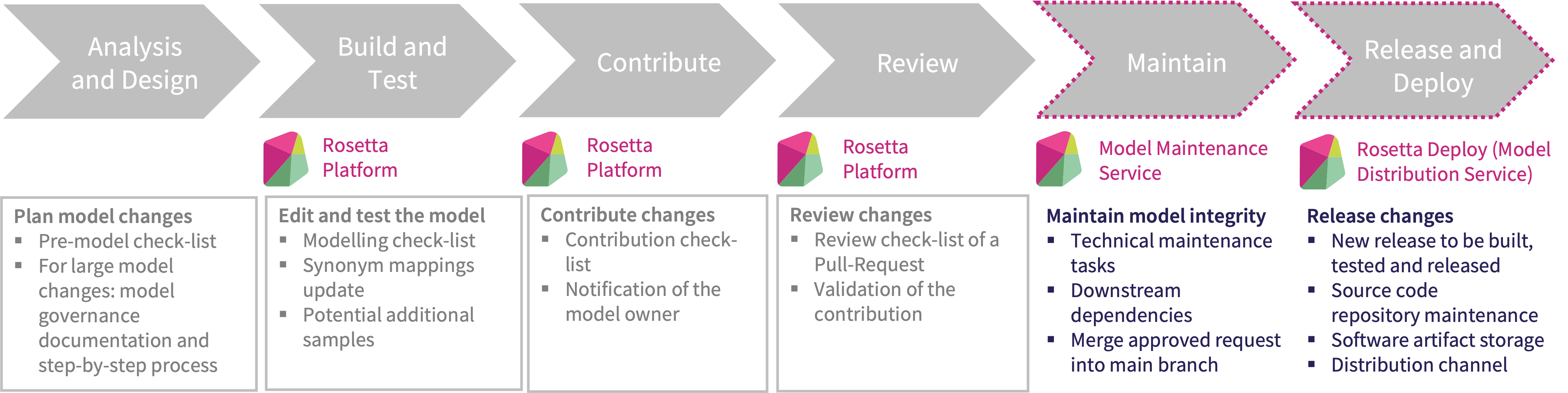 The steps required to change the CDM are aligned with the software development lifecycle typically applicable to the development of any other software. This development lifecycle is illustrated in the diagram below. Each step is associated to the relevant component of the Rosetta platform that can be used to support the development of the CDM.